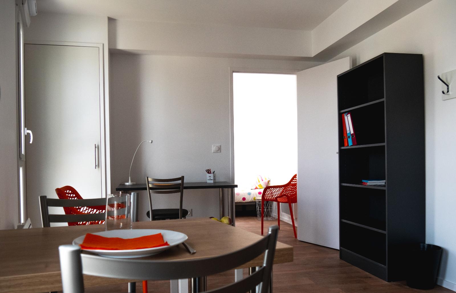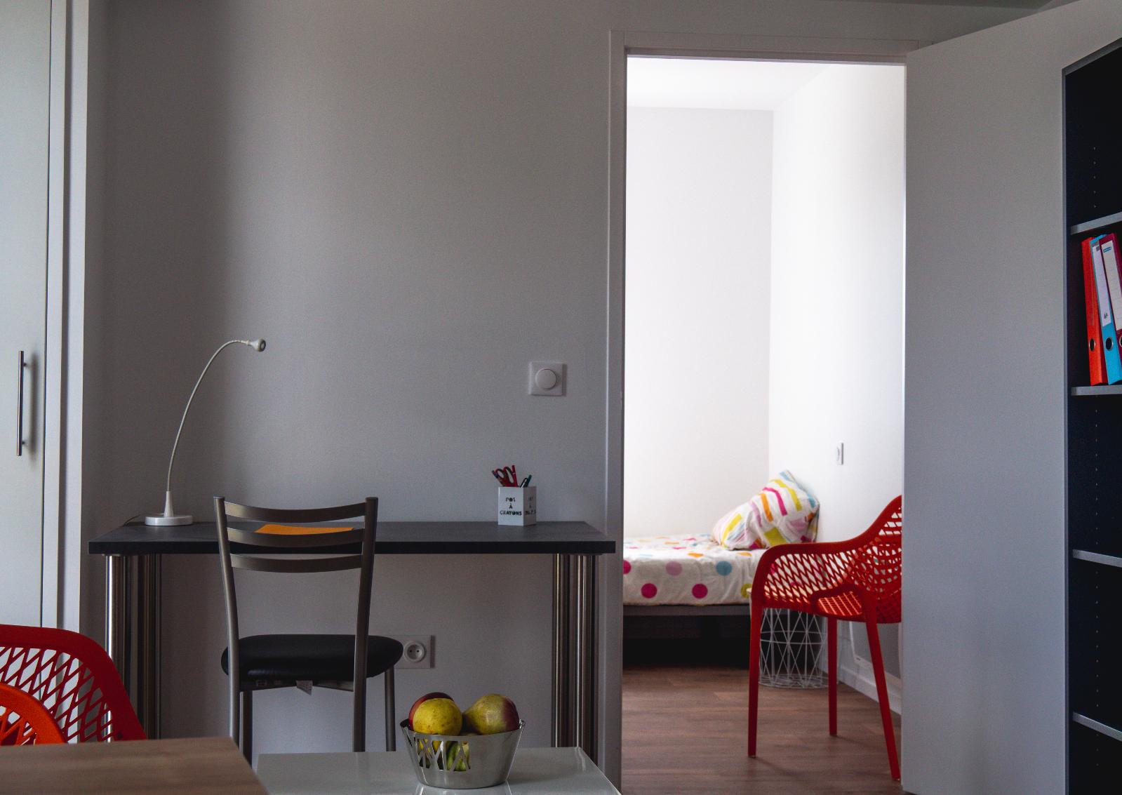 APPARTEMENT T1 MEUBLE de 26.59m² PROCHE CAMPUS UNIVERSITAIRE offrant une entrée avec placard sur pièce de vie principale avec cuisine équipée (plaques de cuisson, réfrigérateur, micro-onde, vaisselles, table de repas) et coin bureau (placard de rangement), un coin couchage séparé (lit, rangement), une salle d'eau avec WC.